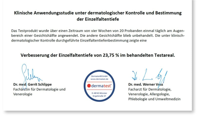The test product Nanofibrous eye strip was applied once daily to the eye area of one half of the face by 20 volunteers over a period of four weeks. The other half of the face remained untreated. From a clinical-dermatological point of view, there were no relevant skin reactions in the test area, and the product was very well tolerated. Neither intolerance reactions in the sense of irritation nor allergic reactions (contact dermatitis) were observed.